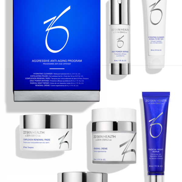 ZO® PHASE 2: ANTI-AGING PROGRAM is an anti-aging skin care regimen with six products: ZO® OFFECTS® EXFOLIATING CLEANSER, ZO® OFFECTS® EXFOLIATING POLISH, ZO® OFFECTS® TE-PADS ACNE PORE TREATMENT, ZO® OSSENTIAL® DAILY POWER DEFENSE, ZO® OSSENTIAL® GROWTH FACTOR SERUM PLUS, and ZO® OCLIPSE® SUNSCREEN + PRIMER SPF 30. These skin care products contain ingredients such as salicylic acid, glycolic acid, and small particles to help exfoliate skin and stimulate skin cell growth, as well as ingredients such as retinol, peptides, roxisomes and ultrasomes, Matrixyl 3000, glucosamine, and plant stem cells to help reduce the appearance of fine lines and wrinkles and antioxidants to help prevent future damage.
